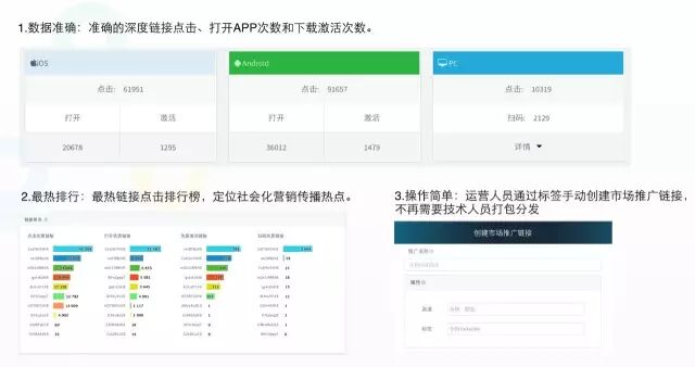 同时,使用深度链接后,我们提供详细的点击、打开、激活、留存分析(此功能在内测)事件转化及链接热度排名等。通过我们提供的数据可视化中心,产品经理和运营人员可以方便的知道外部的流量到底对自己的APP流量贡献是多少、哪些流量渠道才是高质量的渠道,同时也能分析出哪些APP内容会被用户在社交媒体上疯传并能带来大的APP活跃量。