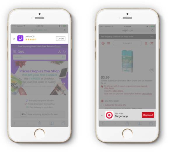 说起APP外部流量召回,除了发送短信、邮件等,从网页中捕获流量导给APP的手段我们也早有接触。京东、知乎这类的早期以网页起家的项目,都会在手机网页上放着一个巨大的“下载APP”的banner或者按钮,促使用户来下载APP客户端从而后去用户更多的关注和使用时间,而不是仅仅让用户停留在网页中简单浏览一下。对于电商、社交APP的而言,这种需求更为强烈,因为H5页面没有足够的用户体验基础和用户安全信任度,他们都倾向于引导用户去APP总下单或者聊天。